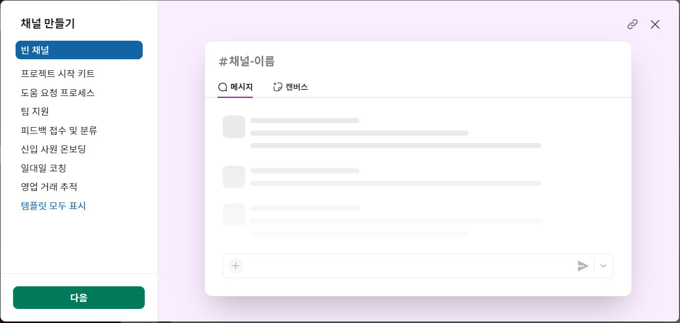 이처럼 생성된 채널은 하나의 채팅 방이라고 생각하면 되는데 채널 추가를 해보면 아래 사진처럼 다양한 템플릿의 채널을 생성할 수 있다. 상황에 맞는 템플릿을 골라서 채널을 생성하여 활용하면 된다.