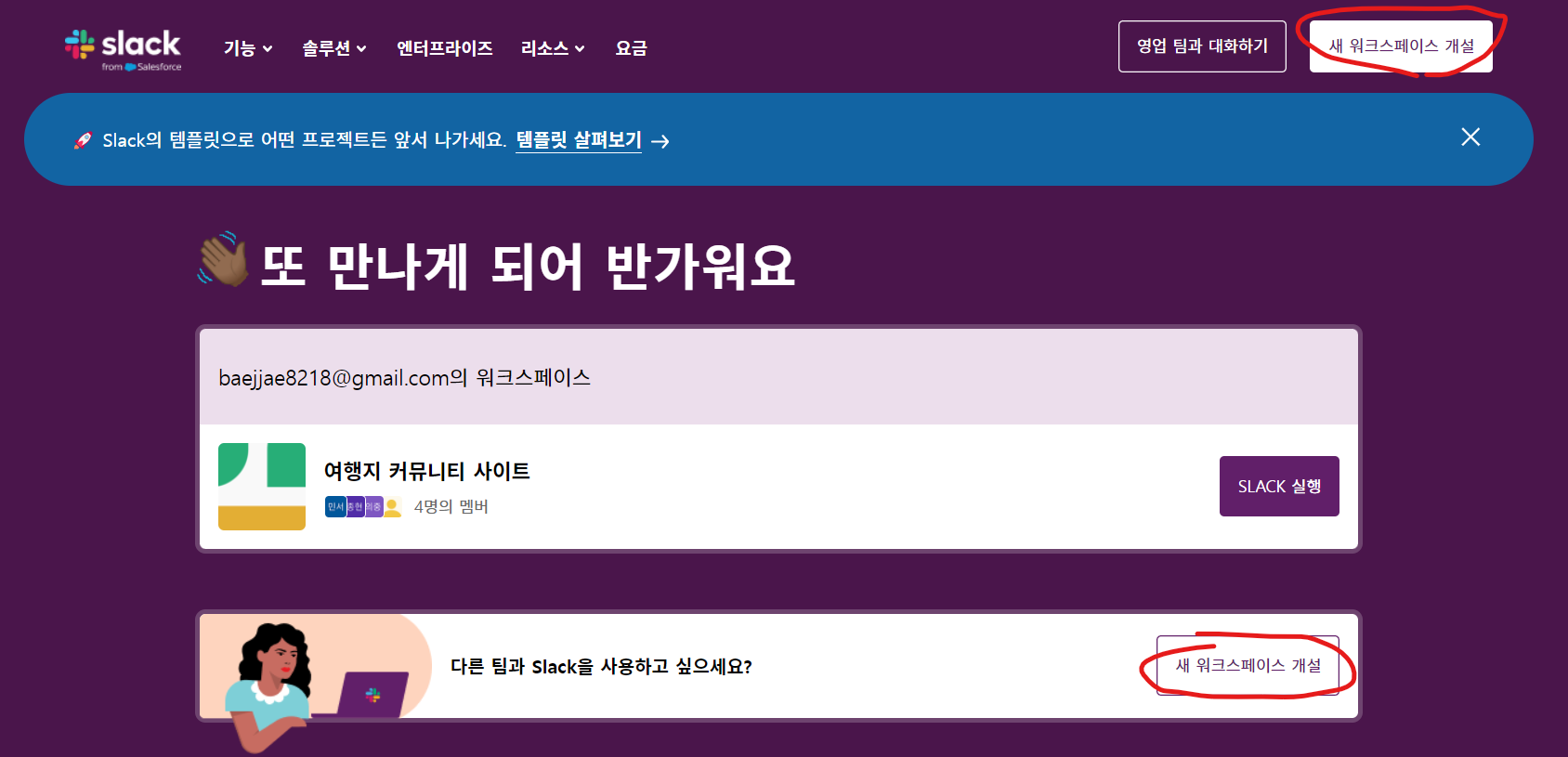 저번에 사용할 당시에는 팀장이 만들어놓은 워크 스페이스에 들어가서 이용했는데, 이번엔 새 워크스페이스를 개설해서 어떤 식으로 활용해야하는 지 처음부터 진행해보았다. 먼저 아래 사진에서 보이듯 새 워크스페이스 개설을 눌러 팀원들과 함께 사용할 워크 스페이스를 생성할 수 있다.