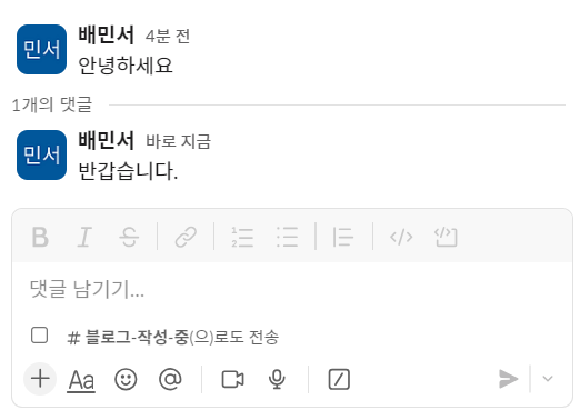 초대된 팀원들은 채널 내에서 각자 하고 싶은 말들을 작성할 수 있습니다. 글을 작성할 때는 위의 꾸미기 메뉴를 활용하여 꾸미거나, 마크다운 형식으로 글을 작성하여 글의 가독성을 늘릴 수 있습니다.