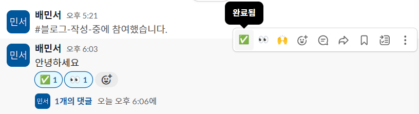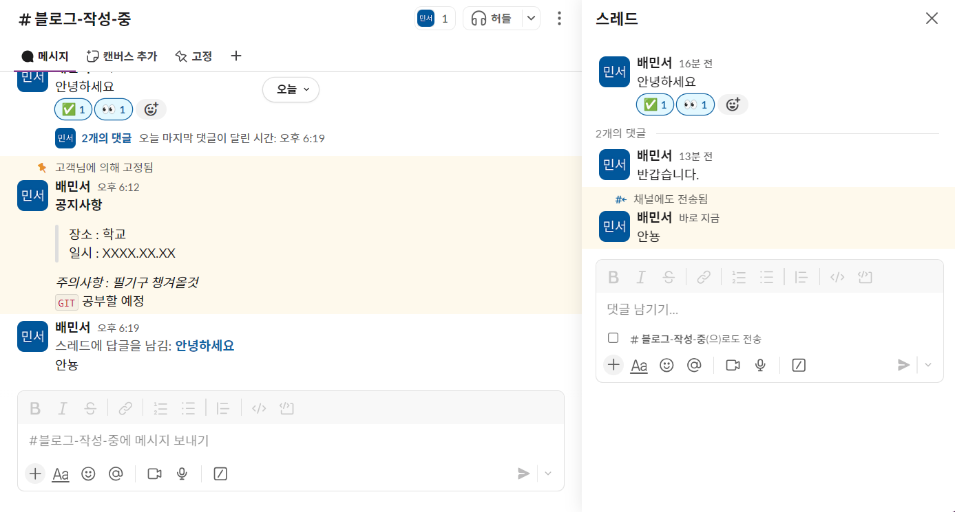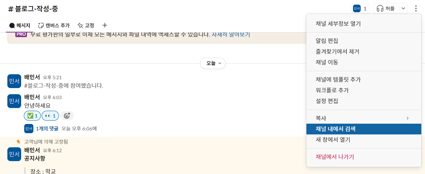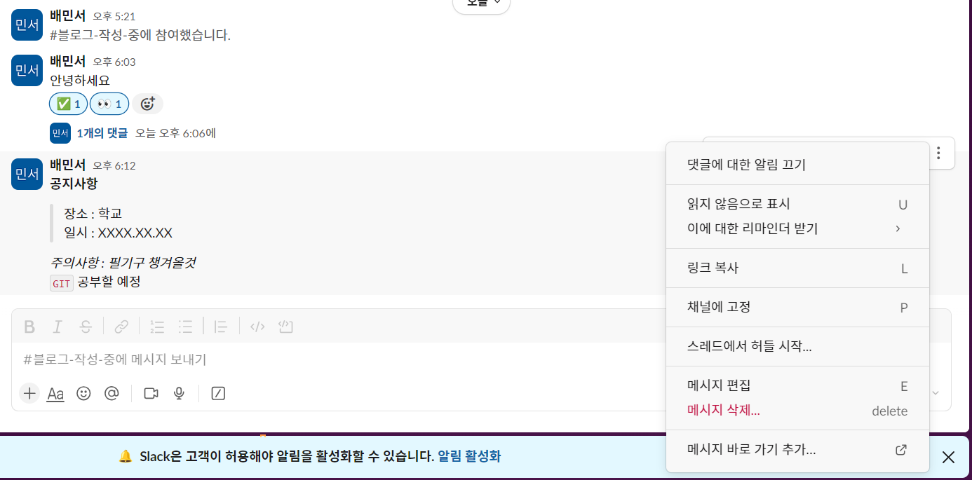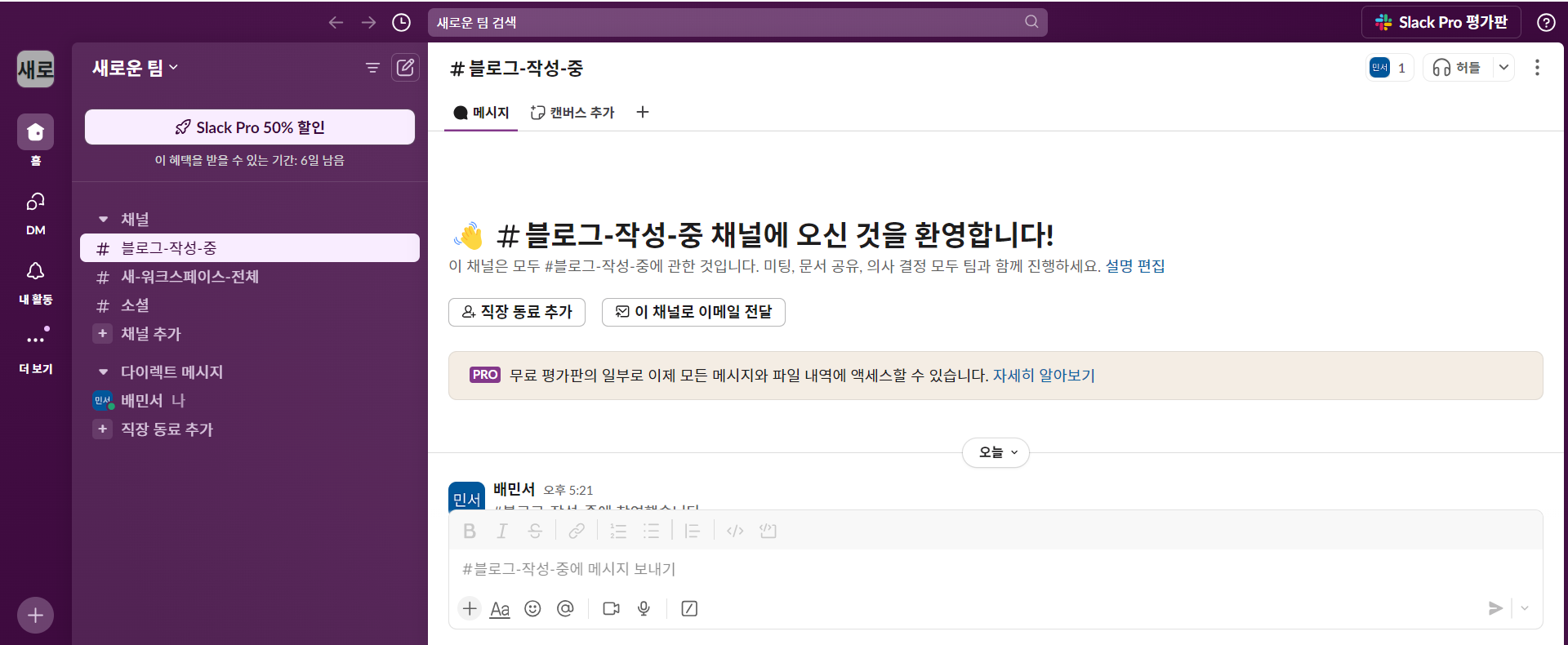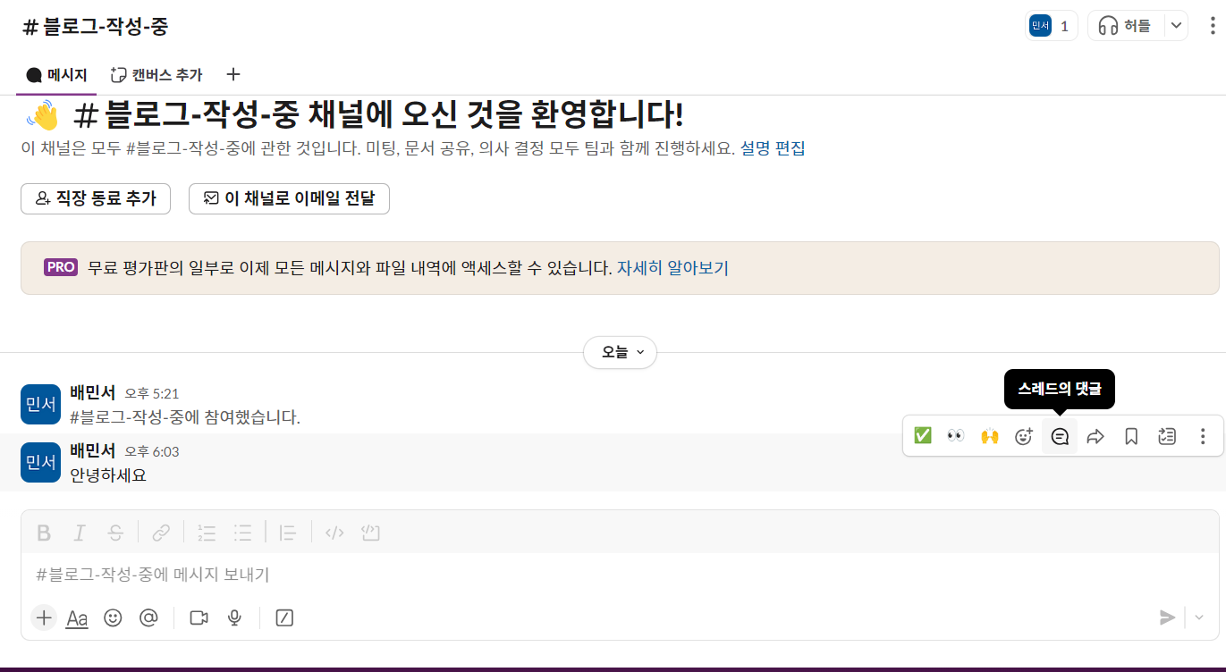 생성하면 이런 화면이 나오게 되는데 아까 작성했던 블로그 작성 중 이란 채널이 먼저 생성되어 있는 것을 확인할 수 있다.