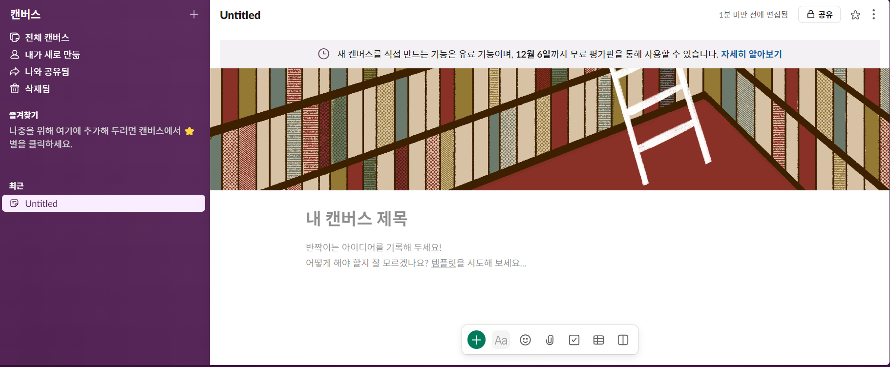 다음은 현재 이 워크 스페이스에서 현재 진행하게 될 일이 어떤 것인지 작성할 수 있다. 이는 하나의 채널로 만들어져서 생성 후에 가장 먼저 볼 채널이 될 것이다.