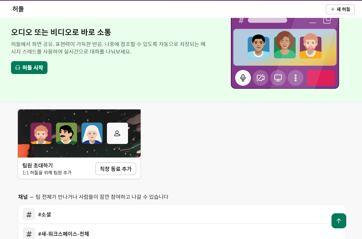 Slack은 팀 간의 효율적인 소통과 협업을 위한 종합 플랫폼으로, 채널을 통해 주제별 대화를 나누거나 프로젝트에 집중할 수 있도록 돕습니다. 또한, 다양한 외부 애플리케이션과의 연동을 통해 파일 공유, 일정 관리, 업무 할당 등 여러 작업을 하나의 플랫폼에서 처리할 수 있으며, 워크플로우 자동화 기능을 통해 반복적인 작업을 간소화할 수 있습니다. Huddles와 Clips와 같은 기능으로 실시간 대화나 비동기적 메시지를 지원하여 팀원 간의 원활한 커뮤니케이션을 제공합니다.